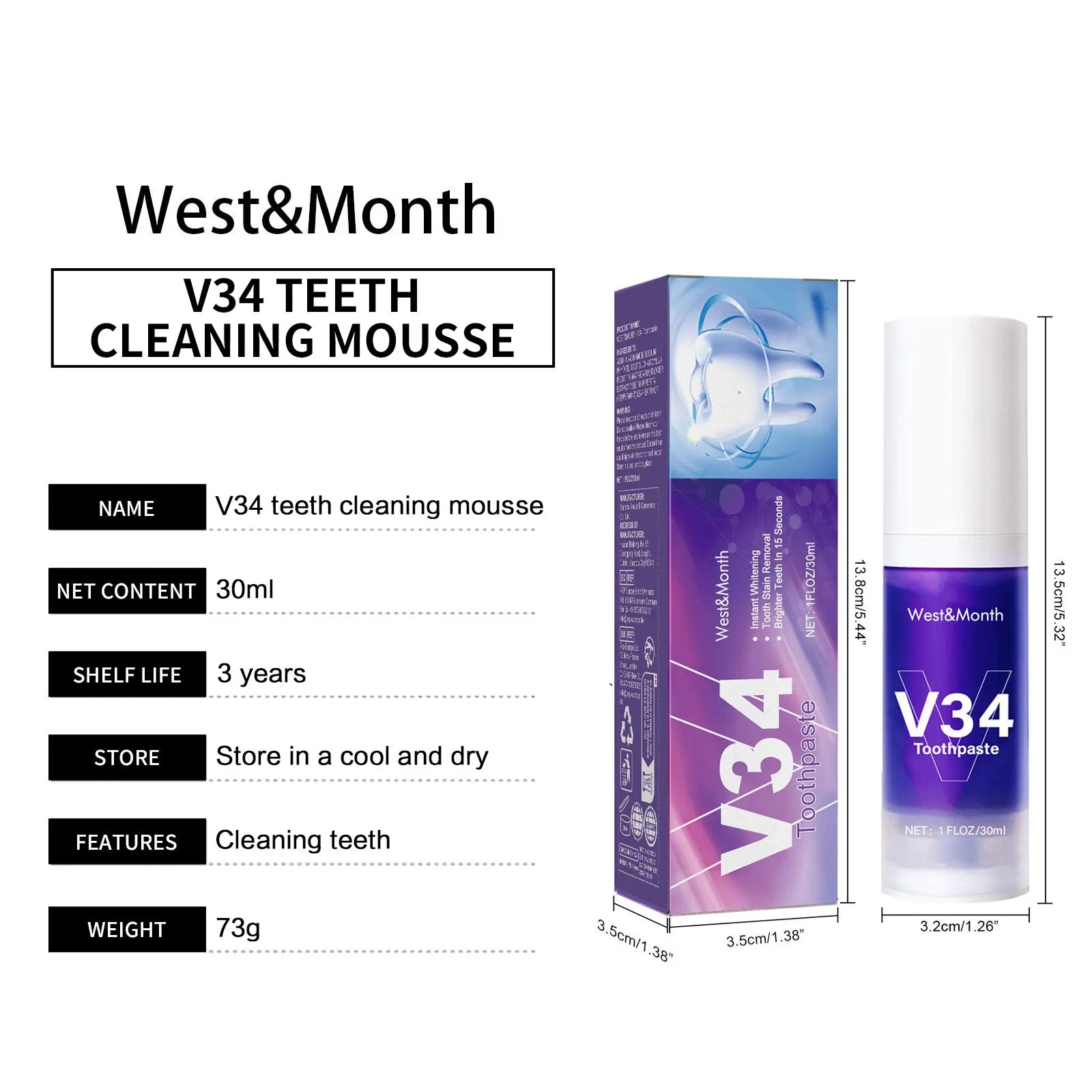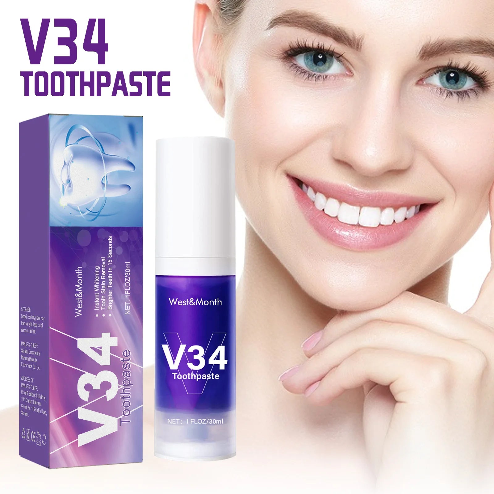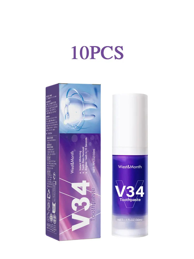 West&Month 30ml V34 Smile Teeth Whitening Toothpaste Stain Tartar Clean Oral Hygiene Fresh Breath Brightening Teeth Toothpaste